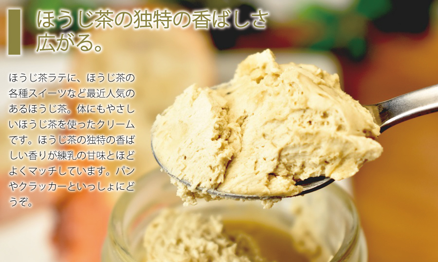 素材がもつ本来の甘味や旨味を活かした濃厚な味わいのある、食工房カイノキのオリジナルクリームです。ほうじ茶ラテに、ほうじ茶の各種スイーツなど最近人気のあるほうじ茶。ほうじ茶クリームは、そんなほうじ茶を使った体にもやさしいクリームです。ほうじ茶の独特の香ばしい香りが練乳の甘味とほどよくマッチしています。パンやクラッカーといっしょにどうぞ。