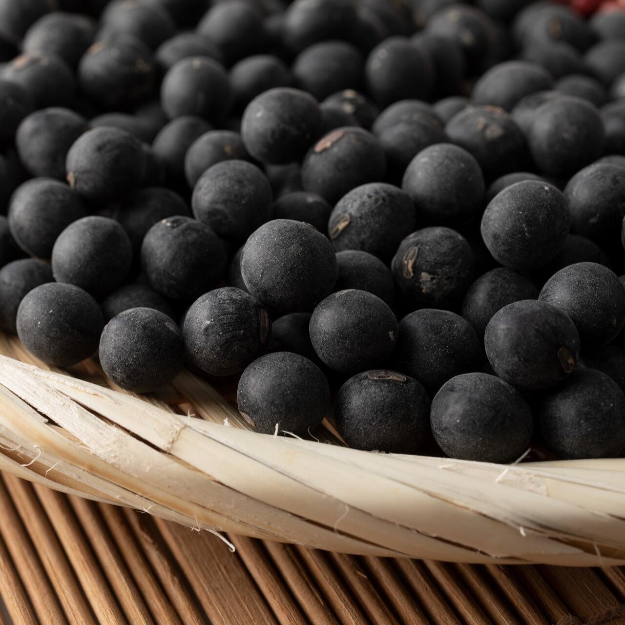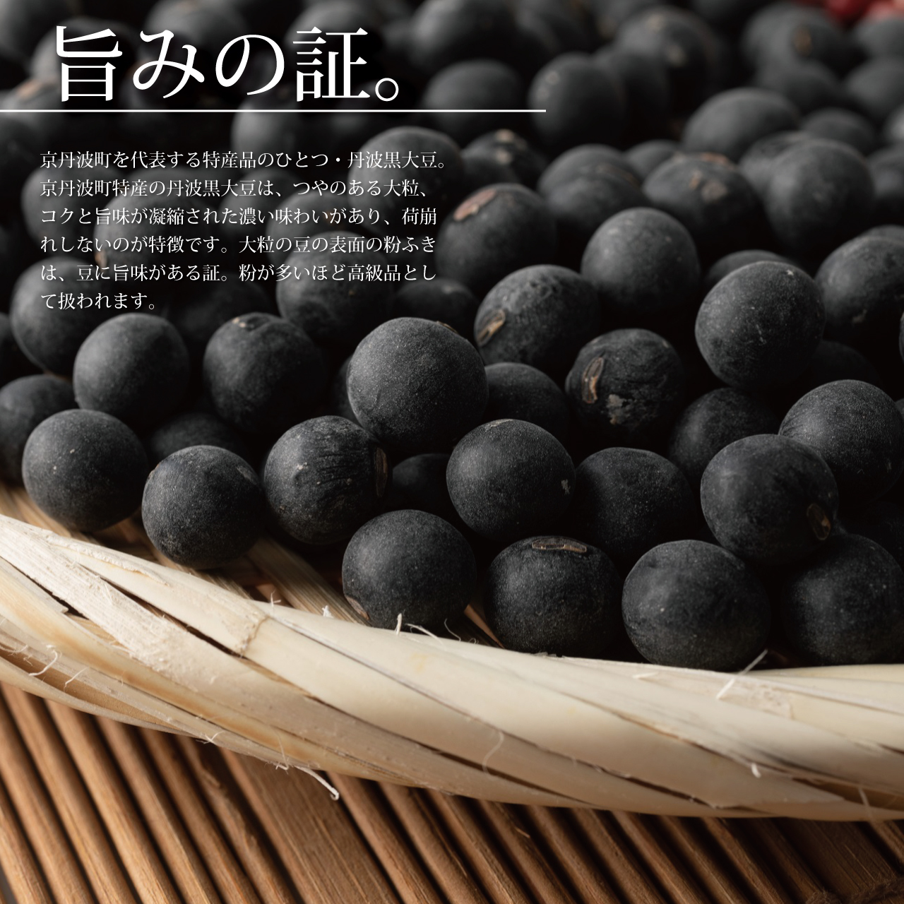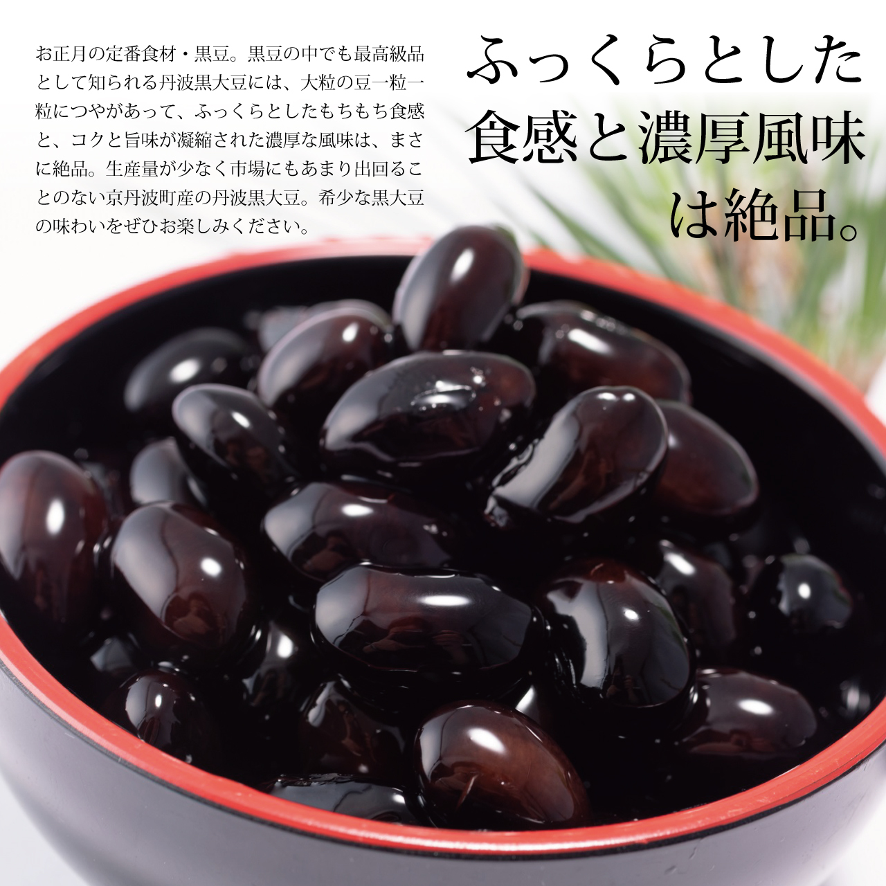 お正月食材として定番の黒豆。京丹波町特産の丹波黒大豆は、つやのある大粒、コクと旨味が凝縮された濃い味わいがあり、荷崩れしないのが特徴です。大粒の豆の表面の粉ふきは、豆に旨味がある証。粉が多いほど高級品として扱われます。炊き上がりのふっくらとした大粒のもちもち食感と旨味の濃い豊かな味わいをぜひ、お楽しみください。